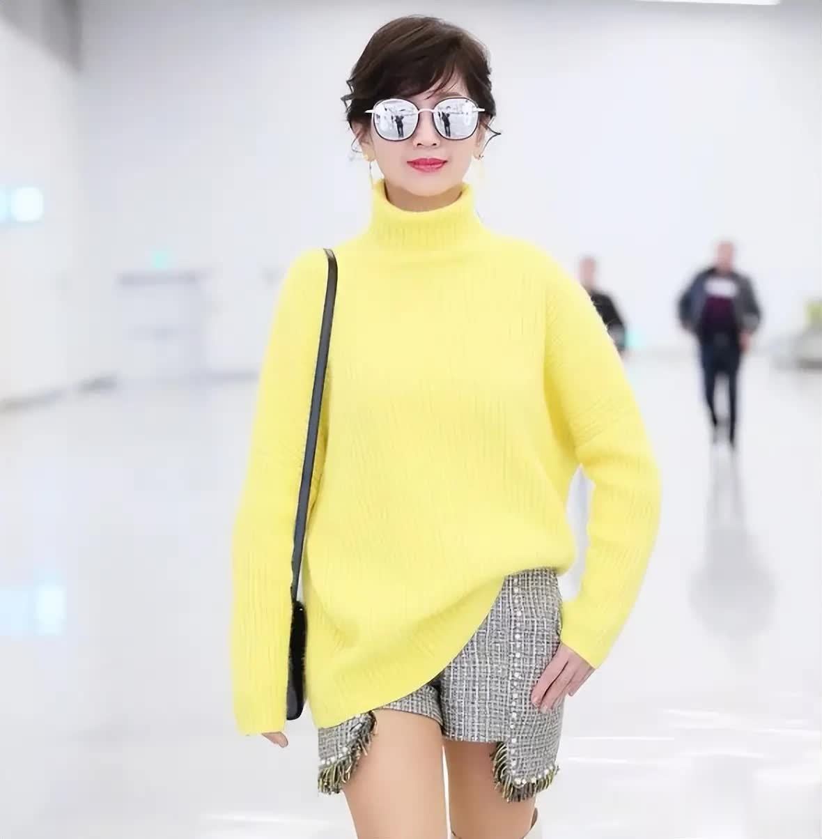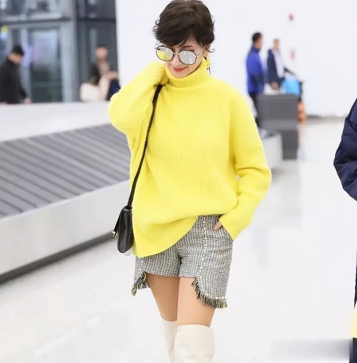身上穿的是黄色款毛衣,有些人购物时看到这个颜色就直接避开了,更喜欢不挑肤色的黑色毛衣。毛衣的衣摆盖住了屁股,为了拉长腿部线条,可以将部分衣摆面料塞到下装裤腰里。要是你喜欢这件黄色毛衣,冬天可以把它买来做内搭。腿上是一件短裤,裤子面料颜色不单一。裤脚处还融入了“流苏设计”,其颜色比裤身更深些。从裤脚处能看出,大腿外侧面料长一些,这种设计挺有个性。